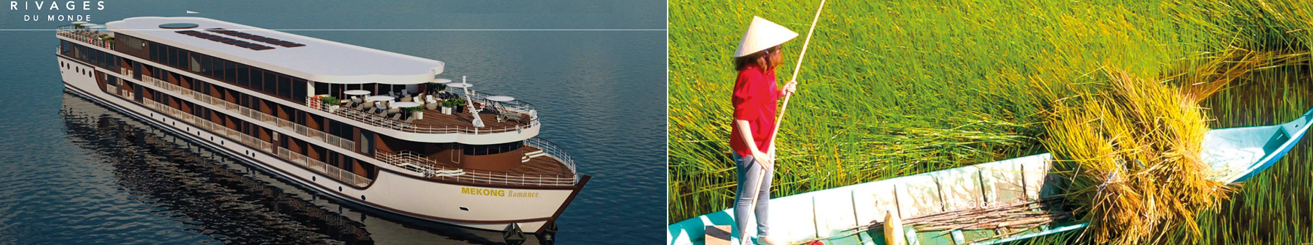 Le Mekong Romance a été soigneusement sélectionné par Rivages du Monde, véritable symbole d’élégance et de raffinement. Avec un nombre limité de passagers et un service personnalisé, ce bateau redéfinit le concept de luxe à bord. L’intérieur affiche un subtil mélange d’influences coloniales et de lignes modernes, avec de belles boiseries, des tons doux et des décorations choisies avec soin, s’inspirant de la célèbre maison de Huynh Thuy Le à Sa Dec, rendue célèbre par Marguerite Duras dans son livre L’Amant.